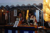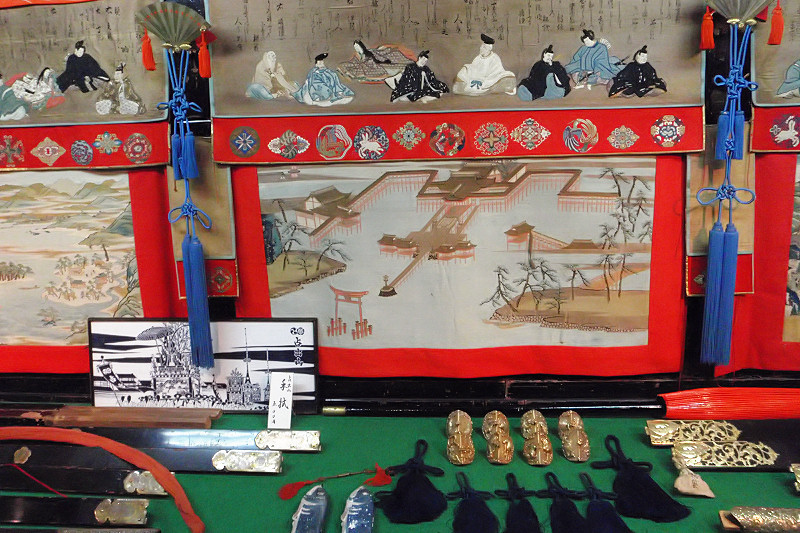 『 「鮎釣山」ともいう。神功皇后が肥前国松浦川で鮎を釣って戦勝の兆としたという説話による。御神体(人形)は金の烏帽子に太刀をはき,右手に釣竿,左手に釣り上げた鮎を持って立つ。神功皇后は古くから安産の神として祀られ,山鉾巡行のくじ順が早いとその年は御産が軽いといわれる。安産の神として公家の信仰も厚く女院や公卿の姫君などから寄進された小袖や打掛,水干などが多数御神体衣装として保存されている。水引は三十六歌仙図の刺繍,前掛,胴掛は日本三景の綴錦で天保二年(一八三一)の製作で,奥川米厳の松島図下絵は別に保存されている。見送には花鳥竜文の綴錦が用いられ,宵山には安産の御守りと腹帯とが授与される。 』 『占出山の駒札より』 友釣り