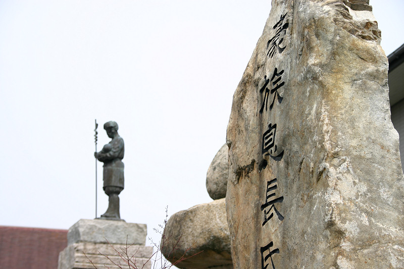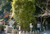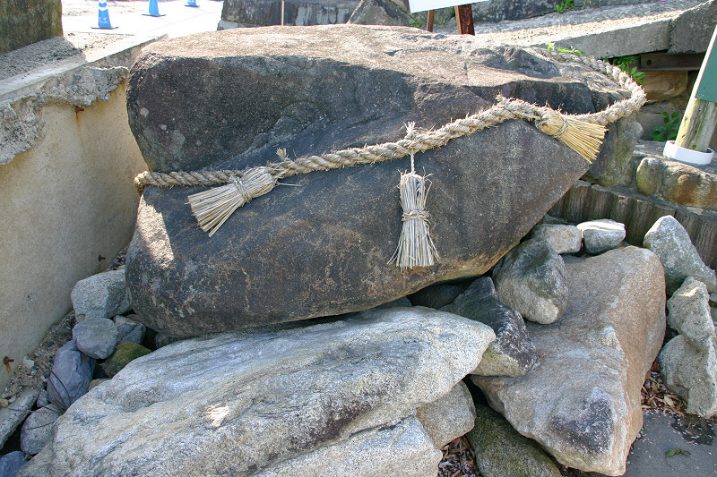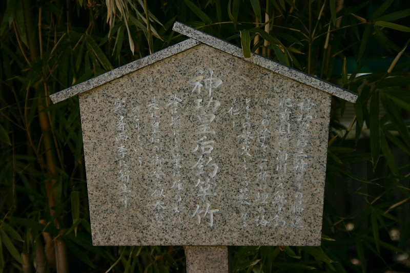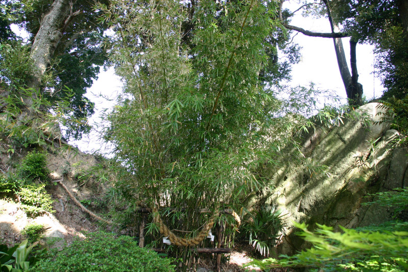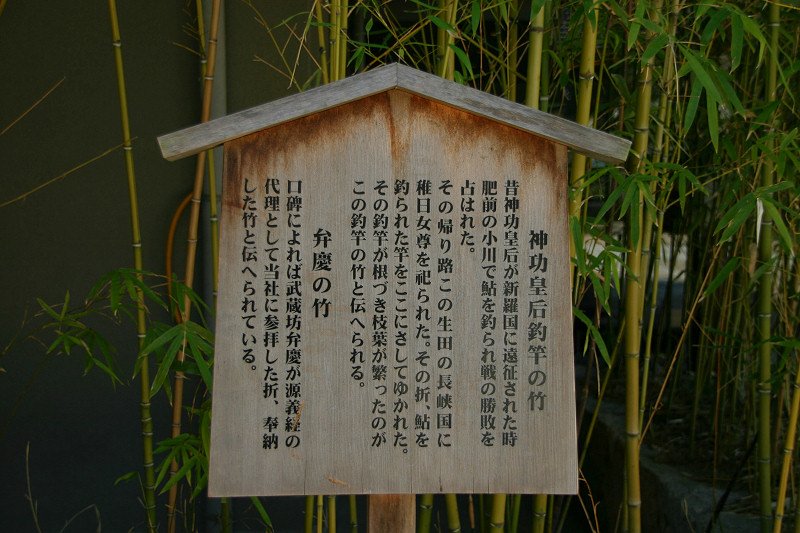 釣竿を埋めたところ竹が生えたという「神功皇后釣竿竹」が「須磨寺」(兵庫県)に,「神功皇后釣竿の竹」が「生田神社」(兵庫県)に,また「玉島神社」(佐賀県)にもあります。 しかし,『東松浦郡史』や『唐津松浦潟』では違った表現となっています。 玉島川の鮎に限り唇金色と言っている様です。 『東松浦郡史』には下記の様にあります。 「金の素針を入れ給ひ鮎を釣り給ふに,忽ちかゝれり,此の素針にて釣り給ひしことは神秘なりとかや,釣竿は攝州播州の堺なる幹竹といふ竹なり,今に生田須磨邊に釣竿竹とてあり,此の金の素鈎にかゝりし因縁にて此の玉島川の鮎にかぎり唇金色なりと謂ひ傳ふ。其の節皇后の上り給ひし石を,紫臺石といふ,今は川底に埋みて見えず,川岸の上に玉島山といふ所あり,則ち皇后の宮を安置し奉り聖母大明神と称し奉るなり。また干珠満珠の山とて二あり,此の山の隣るところに加茂某といふ隠者あり,常に語りていふ,我住所の前に細き土橋あり,溝川なり,前は往還なり,適々大地震と外々騒ぐことあるとき,此の玉島山には地震を知らず,故に此の家に生れたるもの地震を知らずと,其の天理如何と笑談せり,これも御神徳なるべし。」 『唐津松浦潟』では下記の様にあります。 「當時釣竿に用ひ給ひし竹は此の丘上に取りしものにて,今猶其の竹種杜 域内に一叢となつて残ってゐる。又摂州播州の境にある韓竹といへるものも其種顛で,生田,須磨の地方にては釣竿竹として用ひられ てゐるといふ。此の川の鮎の唇金色なるは,金の針を鉤げて鉤となし釣り給ひしによるとか,仲々理屈をつけたものである。 皇后の立ち給ひし石を紫臺石といふ。今は河底に没して見江ず。」