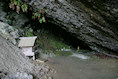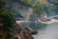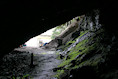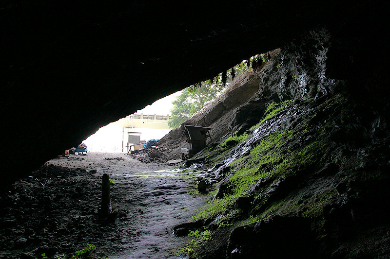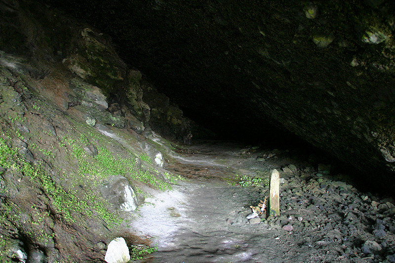 凝灰岩の絶崖にできたこの洞窟は,東に向かって開口しており,幅三○m,奥行き三○mあります。